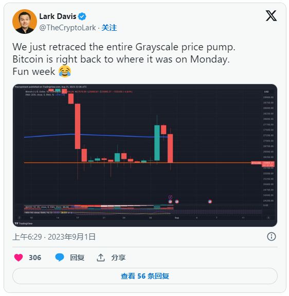 虽然比特币预计会走高,但由于灰度消息的兴奋度减弱,比特币从近期高点 28,184 美元暴跌至 25,548 美元。第二个催化剂是 SEC 决定推迟比特币现货 ETF 申请,导致 8 月 30 日和 31 日连续两天出现红烛,导致 2,500 美元的重大损失。SEC 推迟了 Bitwise、VanEck、Invesco、Valkyrie 和 BlackRock 的申请,给予 45 天的延期来批准或拒绝六项 ETF 提案,理由是需要更多的评估时间。