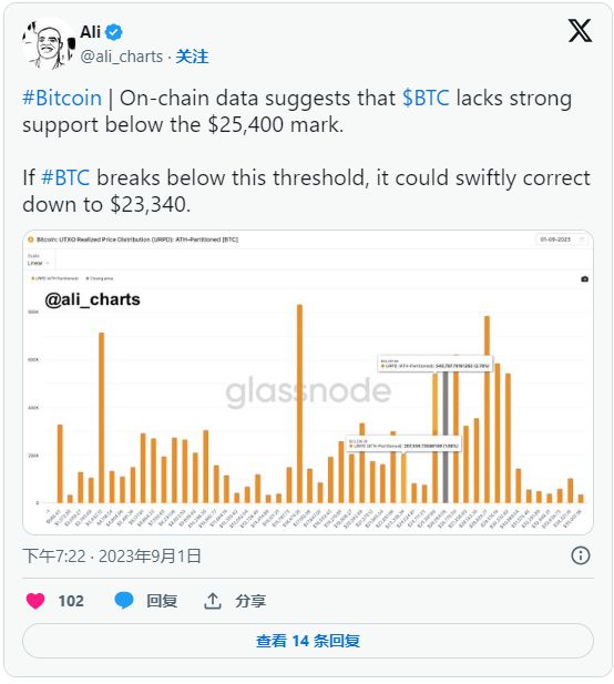 Ali 表示,链上数据表明,比特币可能会跌破 25,400 美元,如果突破该支撑位,可能会跌至 23,340 美元。从历史上看,9 月对比特币多头并不有利,但比特币多头的目标是突破 25,400 美元,从而发起新一轮反弹,目标是 28,500 美元。