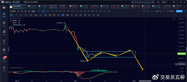 15分钟级别,当前从昨晚插针27587开始的第三笔1h级别的下跌还没有结束,预期至少要回踩下25000~25500区间。当前可能在运行一个15分钟级别的中枢,然后再开始往下跌。