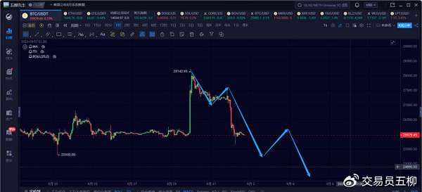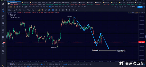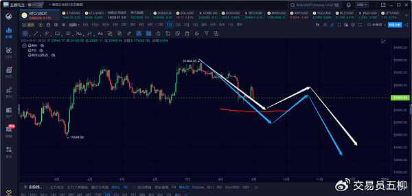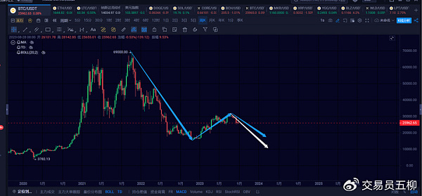 如果没有跌破24000,那未来一个月左右大概率是24000~28000区间的震荡行情,震荡完后继续看第三笔日线级别的下跌去18000。如上图白色箭头。