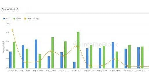 人们先入为主地认为,西方在决定加密资产价格的方向性偏差方面发挥着最关键的作用。然而,当谈到狗狗币时,这种说法最近发生了变化。如下图所示,过去两周,东部地区的交易份额多次超过西部地区。事实上,在某一天,东西方比例为 67/33。