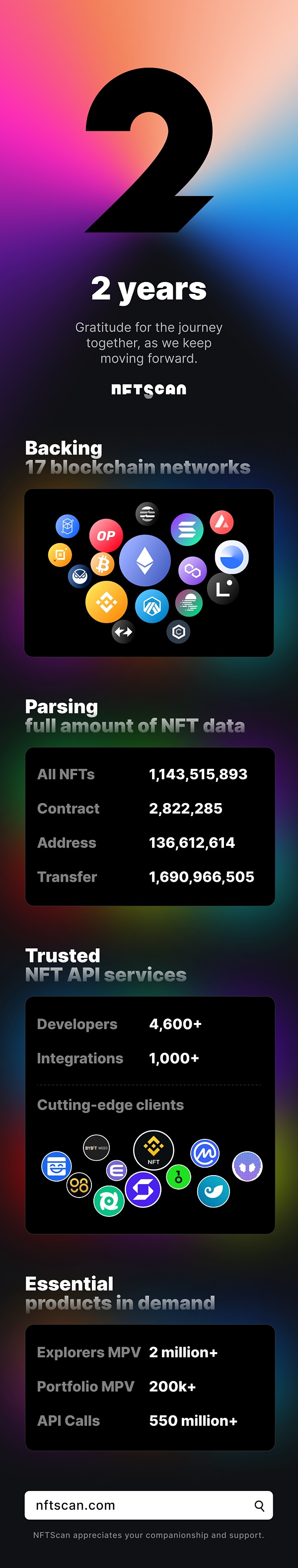 对于 NFTScan 团队来说,两年只是一个起点,我们看好未来 10 年 NFT 领域的繁荣发展与大规模增长,我们将与 Web3 领域的合作伙伴一起,构建 NFT 世界。