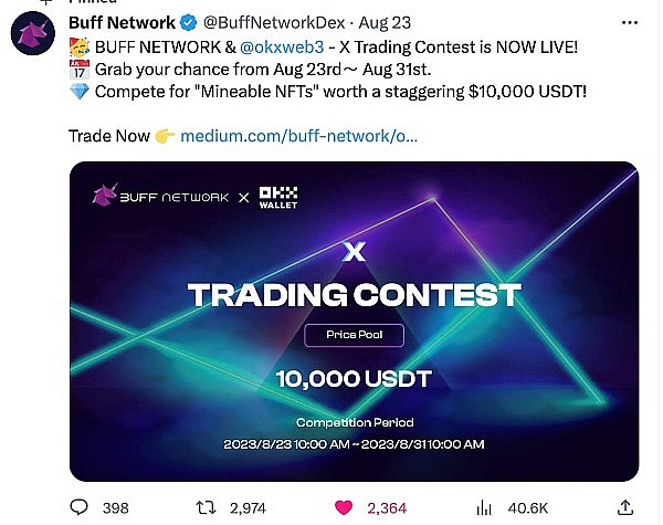 最近的一次亮点是BUFF NETWORK与OKX Wallet联手举办的交易大赛。这不仅是BUFF NETWORK展示其创新合作策略的一个例子,也预示着这场活动可能会吸引更多的交易者加入BUFF平台,从而增强其在DEFI领域的影响力。