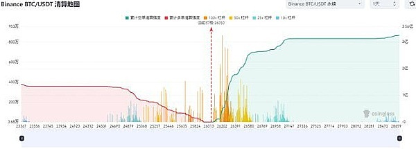 比特币合约清算:根据比特币合约清算图,合约积累在26000上方,因此可能会在26300-25700之间震荡。这个区间可能提供了清算合约的机会。