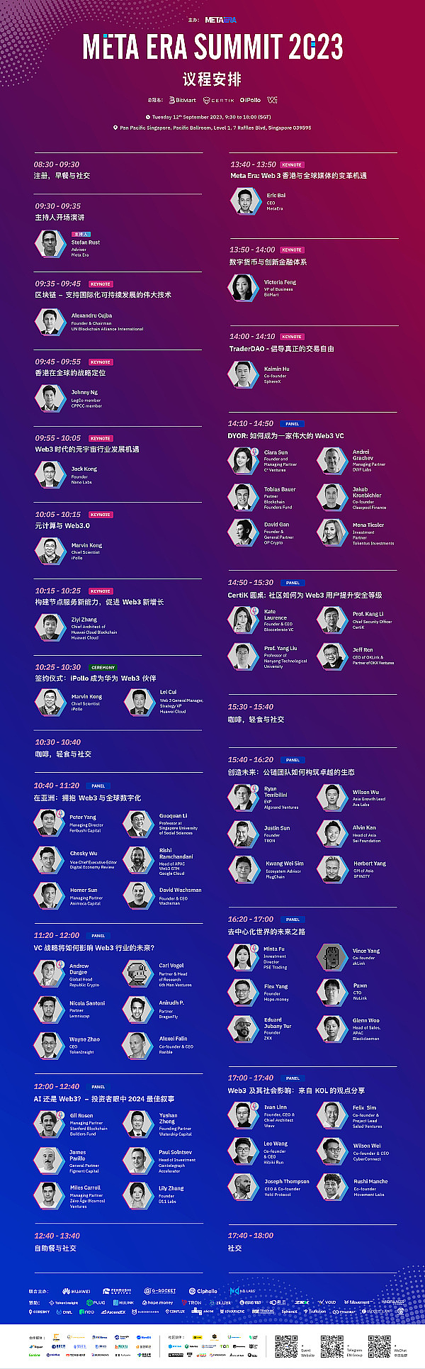 由区块链媒体 Meta Era 主办,BitMart, CertiK, iPollo, Web3 Lab总冠名,分布式资本,G-Rocket, Cipholio Ventures,华为云,ND Labs联合主办的Meta Era Summit 2023 今日正式公布官方活动议程。