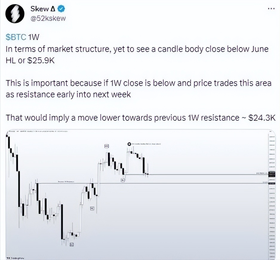 “就市场结构而言,尚未看到蜡烛体收市低于6月较高低点(HL)或25900美元,”受欢迎的加密交易员Skew在推特写道。他提到了低于25000美元的较高低点,其中25900美元是本周收复失地的关键线。