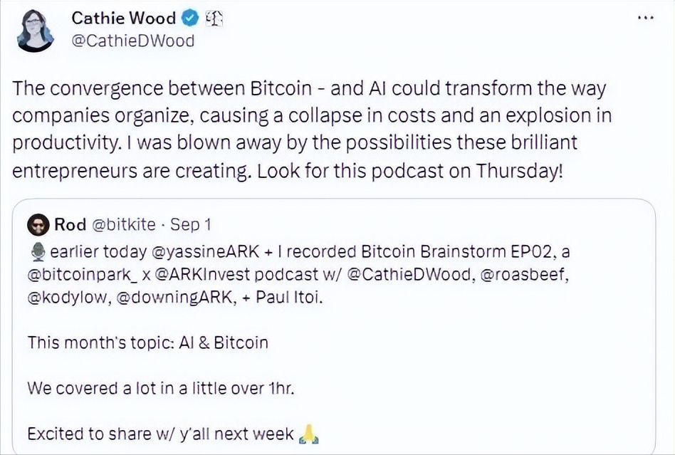 伍德周日在推特写道:“比特币与人工智能(AI)的融合,可能会改变公司的组织形式,进而导致成本大幅下降,并推动生产力爆炸性成长,杰出企业家们所创造的可能性令我感到震惊。”