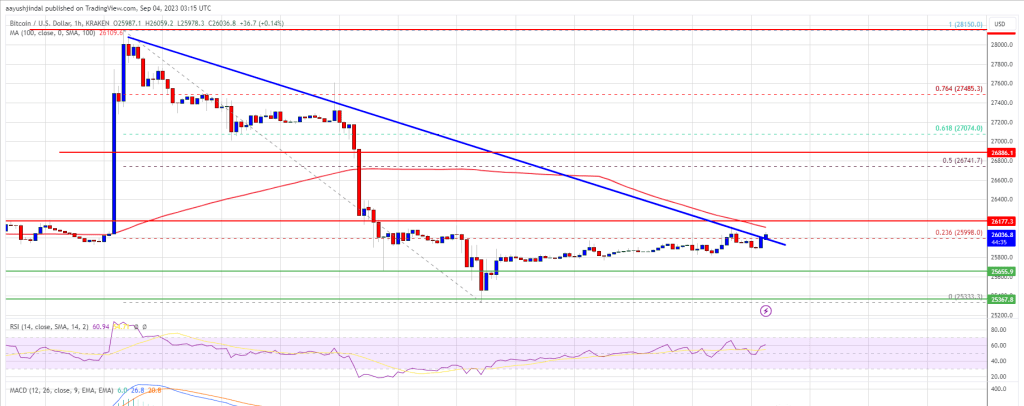 此外,BTC/美元货币对的小时图上突破了主要看跌趋势线,阻力位在 26,000 美元附近。然而,比特币的交易价格仍低于 26,200 美元和 100 小时简单移动平均线。