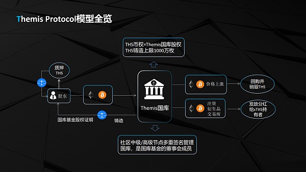 Themis国库在介绍Themis链上私募股权基金之前,先聊聊Themis国库。Themis国库是Themis协议的重要组成部分,也是其独特之处。国库是指存放着Themis协议募集的加密资产的账户,实行多重签名机制,确保资产的安全和监督的有效性。建立国库的意义和重要性在于为协议的参与者提供了价值捕获的机会,同时也为协议的发展提供了稳定的资金支持。首先,Themis国库使得Themis协议具备了价值捕获的能力。国库中存放的加密资产是由参与者铸造THS所募集的,当国库中的加密资产在牛市中大幅度增值时,国库的价值也会相应提升。在国库资产大幅度增值时,通过社区提案,以及国库多签授权,卖出部分国库资产,进行国库股权代币THS的回购销毁,实现股权代币THS的通缩和价格上涨,为投资者提供了一个稳定且有潜力的投资机会。其次,Themis国库为协议的发展提供了稳定的资金支持。在Themis协议中,国库资产将作为协议的基础资金进行投资和运营。国库的多签机制确保了这些资产的安全和有效管理,使得协议能够持续地进行投资和发展。早期,国库中的资产主要用于注资Themis去中心化衍生品交易平台,Themis衍生品交易平台的营收主要用于国库股权代币THS的持股分红,实现THS代币的长期价值捕获,提升股权代币THS的价值。此外,Themis国库还提高了协议的信任度和透明度。国库的多重签名机制确保了资产的安全和监管的有效性,避免了单一参与者操控资产的可能性。所有的资金流动和分配都由智能合约自动执行,公开透明。这为参与者提供了一个公平公正的投资环境,增加了协议的信任度。总的来说,Themis国库是Themis协议的核心之一,具有重要的意义和价值。通过国库的运作,协议为参与者提供了价值捕获的机会,同时也为协议的发展提供了稳定的资金支持。国库的多重签名机制确保了资产的安全和监管的有效性,增加了协议的信任度和透明度。通过国库,Themis协议为投资者提供了另一种安全、透明、有潜力的投资机会——链上私募股权基金。Themis链上私募股权基金运作机制Themis的运作方式是通过铸造发行THS代币,将募集到的比特币(BTC)、以太坊(ETH)等蓝筹加密资产存入Themis国库。国库采用多重签名机制,确保资产的安全和共同管理。而THS代币的数量则代表了占有国库资产份额的凭证。因此增加自己所占有的国库主流资产份额的唯一途径便是增加持有的THS数量:购买THS并选择高收益质押:投资者可通过购买THS代币来增加自己的份额,并选择将其进行质押以获取最高2658%的年复利收益。这种方式可以帮助投资者在占有国库主流资产份额的同时,获取额外的收益。布道THS并升级为节点:在Themis协议中,用户可以通过布道THS并升级为节点的方式,参与到协议的决策和治理中。作为节点,用户每10天可以通过DAO分红机制获得额外的THS,进一步增加自己的持有量。在熊市中通过发行铸造THS代币并募集主流加密资产存入国库,国库资产代表了一篮子蓝筹加密资产并不断增加。当Themis衍生品交易功能正式上线时,将进一步增值国库资产,使THS成为一种有国库资产支撑的高价值加密资产。而以蓝筹资产为代表的国库资产在牛市以及通过衍生品交易所的增值,将会带动THS回购销毁,并向THS或sTHS持有者进行分红,为用户实现价值捕获。因此,Themis可被视为一种链上的早期私募股权基金协议。