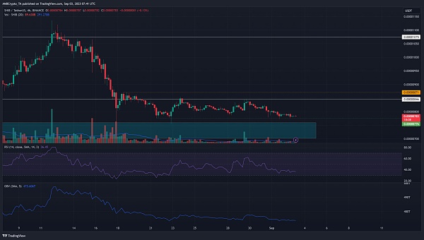 这暗示柴犬公牛可能很累。自8月中旬以来,OBV一直处于明显的下降趋势,并且尚未开始复苏。RSI也显示出强劲的下行势头。