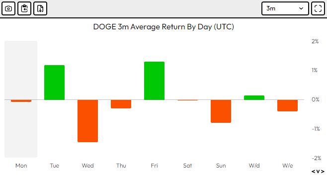 与更广泛的加密市场类似,狗狗币的价格最近也表现不佳。根据Velo Data的数据,即使在最有利的交易日,即周五,DOGE的3个月平均回报率也未能突破1.3%。同样,在最糟糕的交易日,即周三,偏差不超过 1.46%。这一趋势清楚地描绘了网络停滞如何转化为狗狗币的价格停滞。