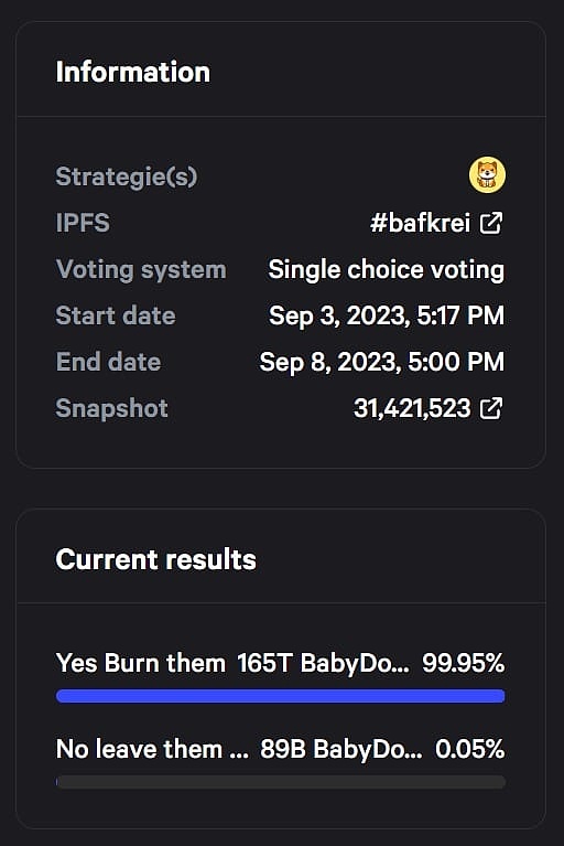 截至撰写本文时,大多数投票赞成批准销毁。但距离快照民意调查结束还剩 4 天,这种情况可能会发生变化。
