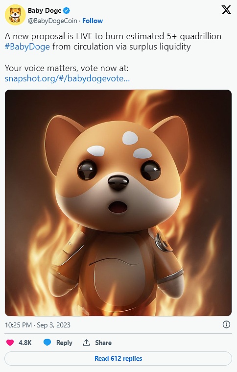 就在大型人工智能揭幕的前一天,Baby Doge Coin 在他们的社区中发布了一项重磅提案。它通过快照投票分享,要求持有者批准燃烧超过 5 万亿个 BABYDOGE 代币。