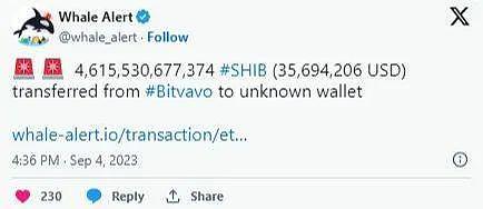 有趣的是,最近从 Bitvavo 进行的转账并不是本月内的孤立事件。总之,Bitvavo 促进了惊人的 9,246,061,354,748 个 SHIB 代币的流动。这是在过去三天内完成的。与该公司八月份的活动相比,这是一个显着的增长。在此期间,他们在单笔交易中总共转移了 4.6 万亿个 SHIB 代币。