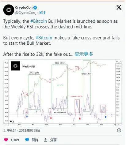 然而,CryptoCon 指出了一个指标,表明 BTC 价格趋势可能发生变化。根据该推文,一旦每周相对强弱指数(RSI)突破 50 大关,比特币通常就会进入牛市。从历史上看,在假交叉之后,当每周 RSI 从两个支撑位反弹时,牛市就会随之而来。