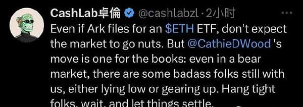 ARK递交的ETH ETF申请引来了短暂的热潮,让比特币和以太坊短暂上扬。然而,这股热情就像一场夏夜的烟火,短暂而快速消失,回归了原来的平静。现在的市场环境更像是在新闻的推动下摇摆不定,但这些新闻只能带来非常短暂的影响。整个市场好像随时準备进入一个更深的熊市,一种压抑而沉重的氛围㳽漫在投资者心头。然而,在这种不确定性中,我们不能忘记有人像Cathie Wood、Saylor等这样的猛人依然和我们站在同一阵缐上。他们沉淀著、埋伏著,就像是一群经验丰富的𢧐士,在等待合适的时机再度出击。就像古印度的Bhagavad Gita所说,“你有权进行你的指定工作,但对其结果你无任何权利。”也就是说,当局势不明朗的时候,最重要的是持续在正确的道路上耕耘,而不是过于关注短期的结果。总之,即便前路是那麽不确定,也许正是这样的时候,我们更需要静心等待,不被瞬间的利好或利空牵动情绪,毕竟真正的机会往往就出现在最不被看好的时候。所以,就让我们一起静候那个最佳时机吧。