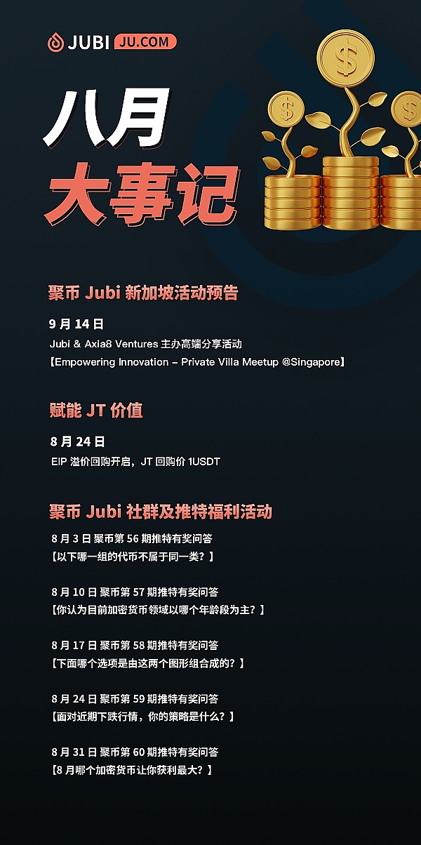 聚币Jubi 8月大事记|聚币新加坡活动即将举办 汇聚海外知名项目重要嘉宾
