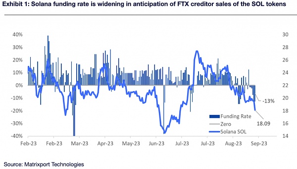 Matrixport 的报告强调了 Solana 融资利率的不断扩大,这一发展是由 FTX 债权人出售 SOL 代币的预期推动的。预计 FTX 债权人可能会出售价值 11.6 亿美元的 SOL资产,预计将有总计 34 亿美元的加密资产进入市场。这次即将到来的销售不仅给 Solana 周围,而且给更广泛的山寨币市场带来了不确定性,导致 SOL 的价格在过去一周内下跌了 -6%。