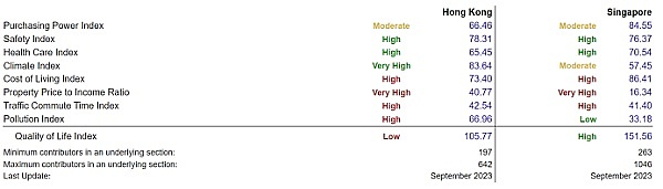 图 2 来源:Numbeo网站,新加坡与香港生活质量指数比较图