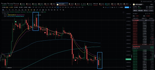 即将公布最新的老美CPI数据,从历史经验来看,CPI数据公布后,都会出现阶段性的顶点或者低点,既然昨天大饼强势反弹了一波,从收盘情况来看,算是阳包阴的状态,代表着多头还是具备一定的收复能力的,说明25000这个位置,短期守住的概率是极大的,那么今晚只要CPI数据公布后,没有打出新的低点,个人预期这一波回调应该是阶段性结束了!下图这两个位置其实有相似之处,只是方向不同而已!