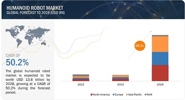 科技创新,必然带动市场需求的不断增长。据Markets and Markets预计,随着人工智能技术的不断进步,人形机器人的市场规模将从2023年的18亿美元增长到2028年的138亿美元,从2023年到2028年的年复合增长率为50.2%,未来将会是一个万亿级市场。