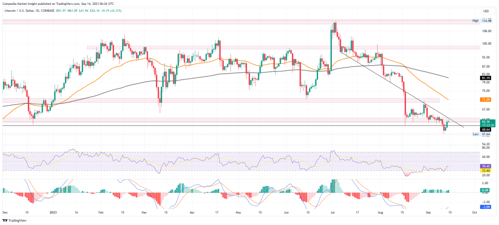 由于 2023 年年初至今的回报率为 11%,LTC 价格失去了 2023 年的所有收益,交易价格为 62.14 美元。LTC价格出现短暂V形反转,第二次重新测试突破趋势线,带来5.63%的反弹。