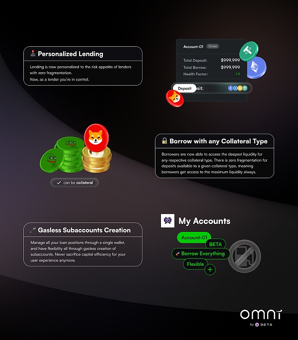 我们很高兴向大家介绍 Beta 协议的下一个发展版本 Omni。Omni 将于 9 月 28 日在 Sepolia 上线,有关获得独家早期访问权和支持该协议进入主网的详细信息将在本周初公布。自几个月前首次发布 Omni 以来,我们不断推进机制设计,以创新去中心化货币市场的基本结构。我们的研发团队一直专注于去中心化借贷中最重要的开放性问题: