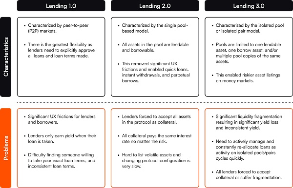 2.0: 资金池模式通过标准配置大大改善了链上借贷的用户体验,但这些标准配置却阻碍了定制和变更。这导致基于资金池的市场停滞不前,没有增长或使用扩展。