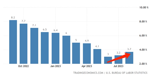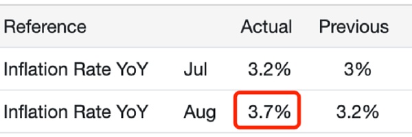 8月通胀3.7%,高于预期值3.6%。前值3.2%