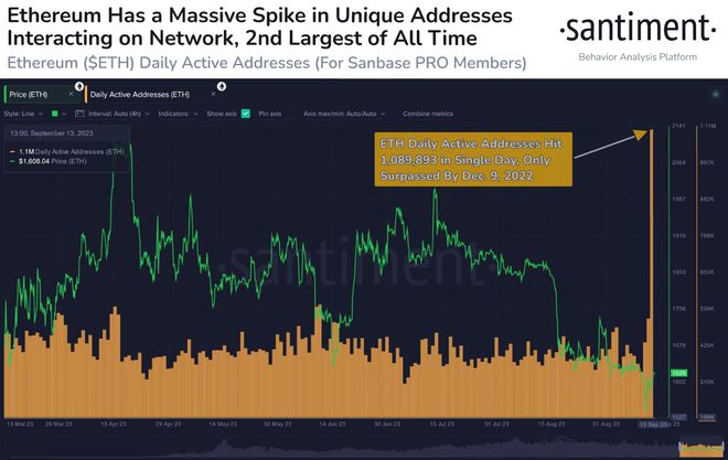 链上数据提供商 Santiment 报告称,以太坊网络上的活动显着增加,9 月 13 日,有 1,089,893 个唯一钱包地址作为 ETH 发送者或接收者参与。这一增长相当于以太坊 8 年多历史上的第二高数字。钱包地址活动的异常增加可能会成为价格回升所需的投降信号。