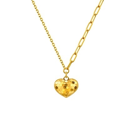 设计师采用独特的3D钻石切割工艺,经镭射无焊料焊接后造成的蜂巢图案,犹如闪耀派对上的镜球,闪闪发亮,崭新的工艺令Goldstyle首饰多维度呈现出微鼓的效果,立体度更强。爱心链坠在多角度的光影折射间绽放夺目光芒,倍添闪烁效果,设计简约,气质百搭。项链还有Goldstyle·X镶钻款以迎合不同风格的需求,展现出足金的华丽和钻石的璀璨融合。