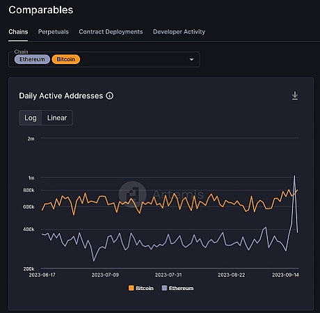 Artemis报告称,在9月13日,以太坊共有103万个日常地址,而同期比特币的地址为743800个。然而,这一数字已经收回,比特币在9月14日再次超过以太坊。