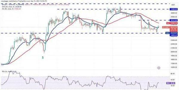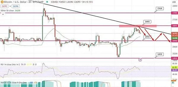 对比特币当前状态的技术分析显示前景温和看跌。目前,该加密货币的交易价格略高于 26,000 美元的阻力位,并稳定在 26,500 美元的双顶阻力位附近,该阻力位目前充当支撑位。