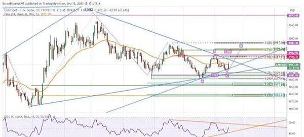 现在有迹象表明近期波动低点可能已经完成,可以预测ABCD模式以帮助确定目标。初步上行目标包括从9月1日波动高点1953美元到下跌至1946美元左右的区间,较低价格区域来自61.8%斐波那契回撤位和前周高点。标准AB等于CD形态的目标是1969美元,这就是CD腿中的价格变化将与AB腿中的变化相匹配的地方,反映了两个波动之间的相似性。