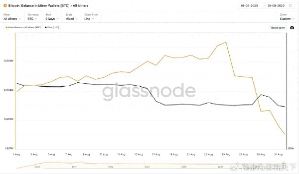 而且, Glassnode的数据显示,自8月25日以来,矿工钱包中的比特币余额大幅下降。