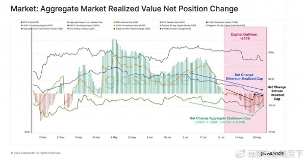 根据Bitfinex 的一份报告,8 月份,比特币、以太坊 (ETH) 和五种主要稳定币从市场撤资约 550 亿美元。加密货币交易所使用聚合实现价值指标来得出结果。