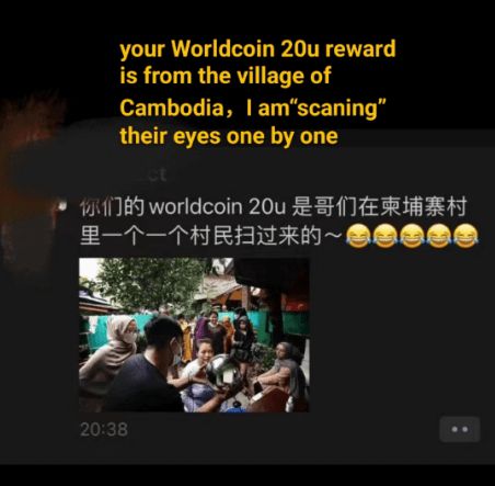 图中聊天室文字描述写着:「Worldcoin 是在柬埔寨村里一个一个从村民扫过来的。」