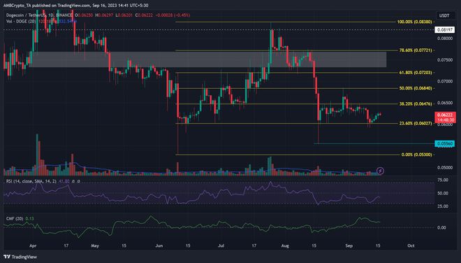 8 月中旬至 9 月中旬期间,DOGE 的综合亏损高于 23.6% Fib 水平(0.060 美元)。8 月底,虚假突破 50% 斐波那契水平(0.068 美元)回落至 0.060 美元。