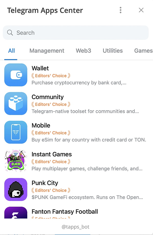 目前,应用程序和一些去中心化小游戏和已经在 Telegram Apps Center 中部署。用户可以在该平台搜索并使用,Telegram 后续将会用更加明显的方式集成到一级页面或二级页面,无需用户搜索后进入应用程序商店。