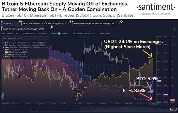 领先的分析公司 Santiment 对比特币做出了积极的预测。报告强调,加密货币交易所上的 Tether (USDT) 供应量已达到 3 月份以来的最高水平,升至 24.1%。这一新趋势与交易所中比特币和以太坊(ETH)资产的整体下降形成鲜明对比。这种下降可能表明投资者倾向于持有代币而不是买卖代币。通过将这两个重要趋势联系起来,可以预期市场购买兴趣可能会增加。