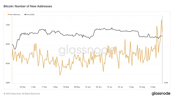 根据Glassnode提供的数据,最近几天比特币新地址的创建量显着激增。第一次显着上升发生在 9 月 9 日左右,新地址数量激增至超过 717,000 个。