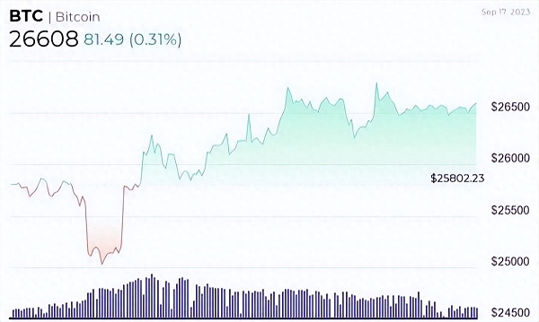 比特币仍稳定在 26,000 美元的水平上方,有望反弹至 30,000 美元。截至发稿时,领先的加密货币交易价格为 26,608 美元,日涨幅约为 0.31%。