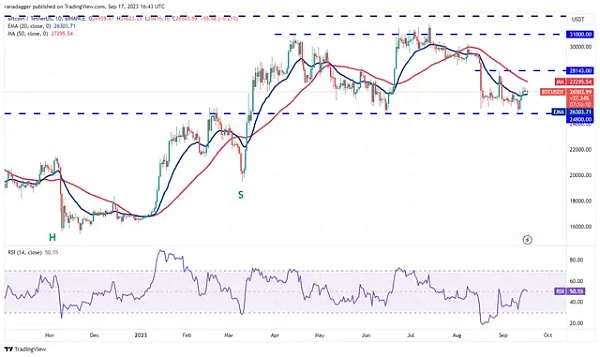 9 月 14 日,比特币升至 20 天指数移动均线 26,303 美元上方,表明抛售压力有所减轻。此后,多头阻止空头将价格拉至 20 日均线下方。买家可能会尝试利用自己的仓位将 BTC/ USDT货币对移动至 50 天简单移动平均线。尽管该水平可能会构成一个小障碍,但如果突破该水平,该货币对很可能会达到 28,143 美元。专家预计空头将强力捍卫这一水平。