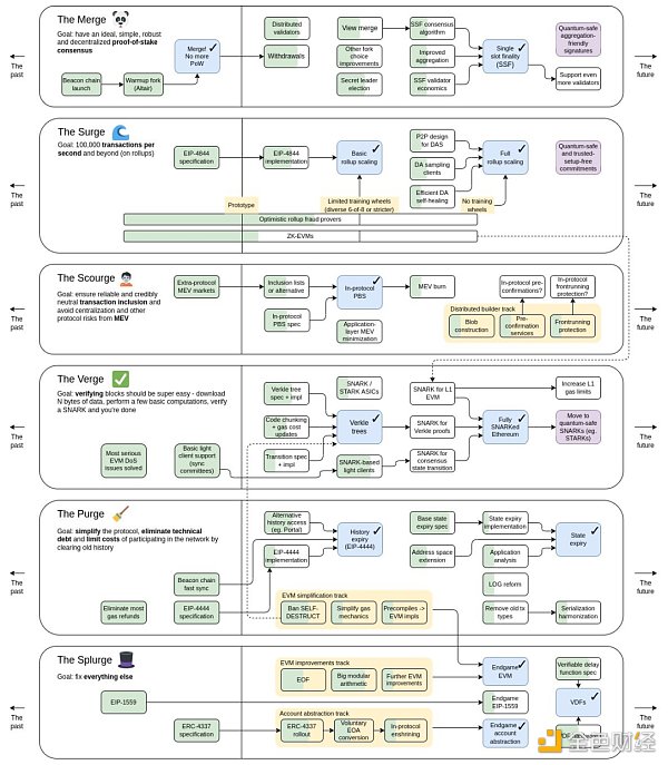 Vitalik 在近期的韩国区块链周、新加坡演讲甚至是以太坊执行层核心开发者会议 (ACDE) 上,都共同提及过一个话题:状态(State),而随之左右的则是与其相关的各种解决方案概念,如无状态、状态过期(State Expiry)、历史数据过期(History Expiry,EIP-4444)、Verkle 树、甚至是地址空间的扩展压缩(Address Space ExpandCompression)。当然,这其实也不是什么新的路线图调整规划,在 Vitalik 去年 11 月发布的以太坊的最新路线图中,这些主要归属于 The Verge 和The Purge 关键路线。