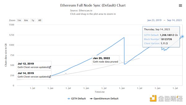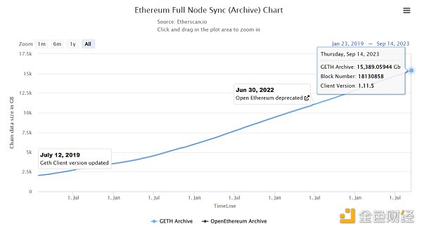 根据 etherscan.io/ 数据,当前运行一个快速同步全节点至少需要 1200 Gb(以 Geth 客户端为例),这还是在已经进行了状态修剪,删除了较早之前的状态数据,只保留最近的状态的前提下。如果是存档节点,即全节点会保留所有历史状态,包括每个区块的状态,那么需要的容量需要约 15,400 Gb,并且未来还是一直增长,即社区常说的 “状态爆炸”。