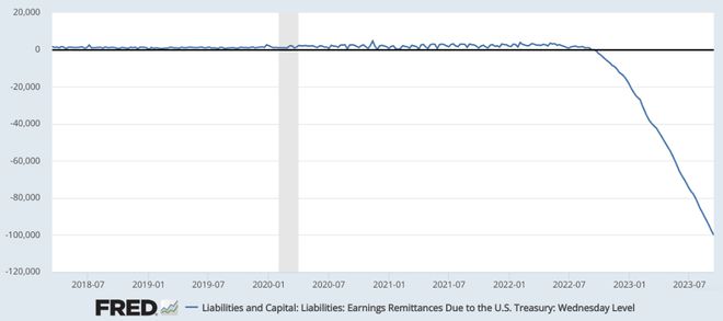 “美联储银行的损失不会增加联邦预算赤字。然而,他们过去上缴财政部的巨额利润现在已不复存在,这有助于减少赤字,本财年迄今为止赤字已达 1.6 万亿美元……”