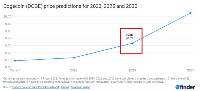 尽管狗狗币今年在排行榜上表现疲弱,但 Finder 的专家小组仍然看好狗狗币。根据 Finder 的价格预测,狗狗币可能在未来两年(即 2025 年)达到 0.33 美元。与目前 0.062 美元的价格相比,投资回报率 (ROI) 上涨约 430%。