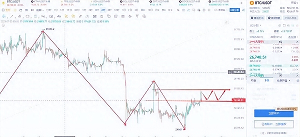 比特币昨日过山车行情,整体节奏先扬后抑,亚盘阴阳循环整理,欧美盘蓄势突破关键阻力27200-27000区域,午夜空头急速反转下挫,最低跌至26600一线并且收盘站稳,那么对于今天的短线操作而言,没有太多好解析的,参考隔夜低点继续做多,盘内越是加剧来回洗盘,就说明变盘在即。技术结构来看四小时图,横向蓄力冲高后走出小幅画门形态,多头虽然回吐了大部分涨幅,但下方支撑依然坚如磐石,昨日的起涨点26400-26600区域是小周期内的中枢区域,由于当前位置靠近中轨均线,顶底转换的节点一定要注意卡点,结合小时线连阴转阳单点切入,做多看涨思路不变。