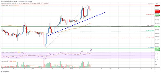 比特币价格在26,200 美元阻力区上方开始大幅上涨。价格稳定在 26,200 美元上方,并在积极区域内交易。