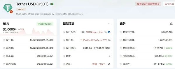 区块链浏览器TRONSCAN数据显示,9月19日,Tether在波场网络增发10亿枚USDT,TRC20-USDT发行量超过438.2亿枚。截至目前,TRC20-USDT持有账户数已超过3000万。